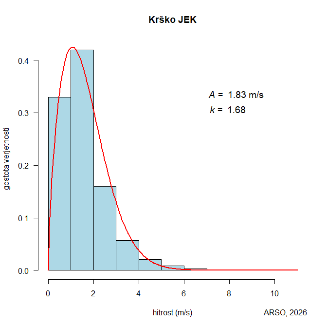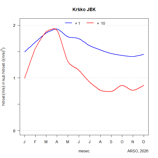 Z modro črto je prikazana povprečna hitrost vetra, z rdečo pa povprečen kub (tretja potenca) hitrosti vetra v odvisnosti od meseca v celotnem obdobju. Kub hitrosti je sorazmeren gostoti moči vetra, gostoto moči vetra dobimo, če ga pomnožimo s polovico gostote zraka. Na ordinati so enote m/s za hitrost in m3/s3 za kub hitrosti. Prave vrednosti za hitrost in kub hitrosti dobimo tako, da vrednosti, odčitane z grafa, pomnožimo s faktorjem na zgornjem robu grafa.
