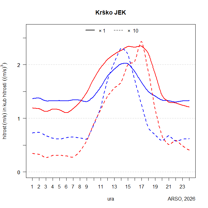 Graf prikazuje povprečni dnevni potek hitrosti (polna črta) in kuba hitrosti vetra (črtkana črta) za januar (modri črti) in julij (rdeči črti). Kub hitrosti je sorazmeren gostoti moči vetra, gostoto moči vetra dobimo, če ga pomnožimo s polovico gostote zraka. Abscisa prikazuje ure dneva. Na ordinati so enote m/s za hitrost in m3/s3 za kub hitrosti. Prave vrednosti za hitrost in kub hitrosti dobimo tako, da vrednosti, odčitane z grafa, pomnožimo s faktorjem na zgornjem robu grafa. Prikazani čas je srednjeevropski (CET).