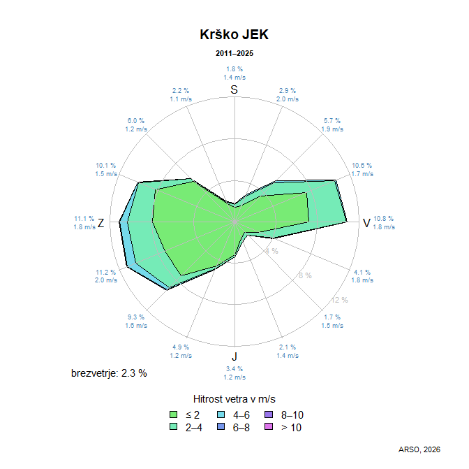 Hitrostni razredi so podani v enotah m/s. Vsote relativnih frekvenc ne znašajo nujno natančno 100 % zaradi zaokroževanja. Brezvetrje je definirano kot veter s hitrostjo manjšo ali enako 0.3 m/s.